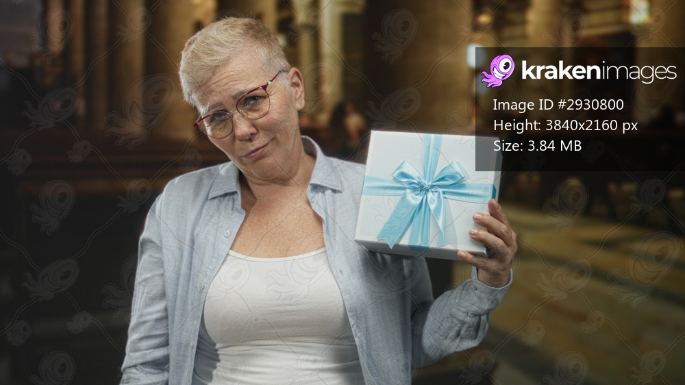 Middle aged woman in glasses holds a white gift box with blue ribbon while seated in church pews near altar; doubt offering.