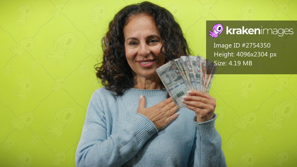 Middle-aged woman in peru holds peruvian soles with one hand on her chest, smiling against a bright yellow background.