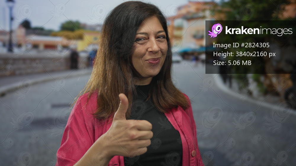 Middle-aged woman in pink jacket shows dual thumbs up gesture on narrow cobblestone street in city outdoors; approval.