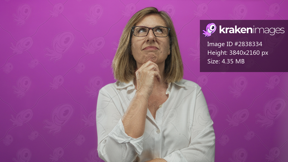 Middle aged woman in purple studio wearing glasses and white blouse gently resting hand on chin; thinking.