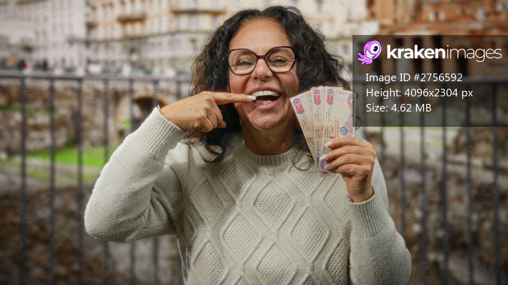 Middle-aged woman in rome points to her teeth while holding uae dirham banknotes, set against a backdrop of city street and ancient roman ruins.
