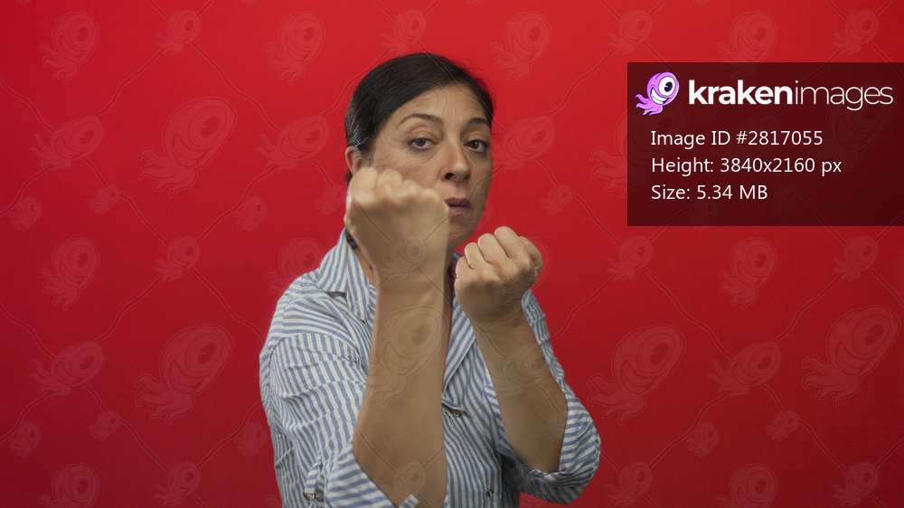 Middle aged woman in striped shirt with bare fists raised in fighting stance in red studio setting; defiance.