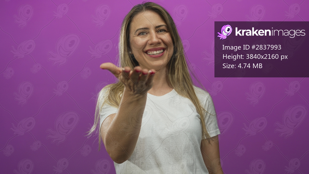 Middle aged woman in studio extends open palm hand gesture towards camera on purple backdrop; welcome.