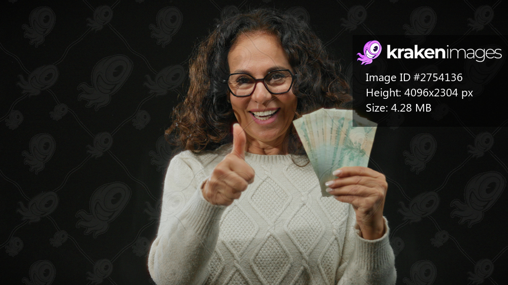 Middle-aged woman in uae, holding dirham banknotes, gestures thumbs up against a black background, showing excitement and success.