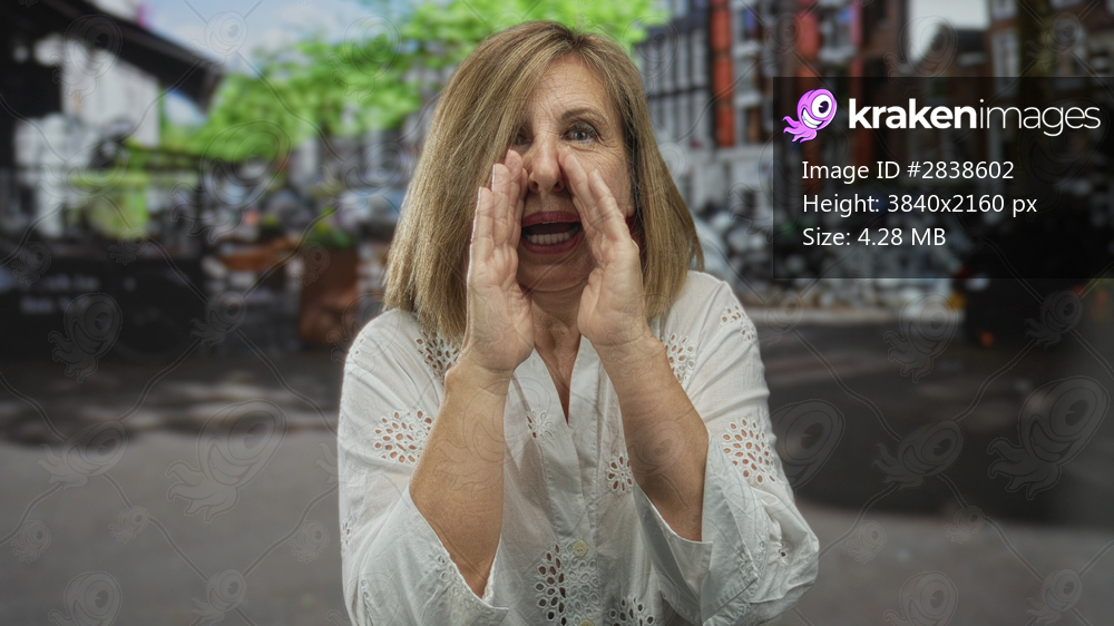Middle aged woman in white blouse cupping hands around mouth to shout along bustling street; urgent warning.