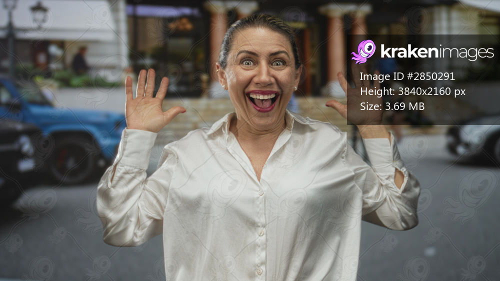 Middle aged woman in white shirt with hands raised and broad smile on busy city street; happy surprise.