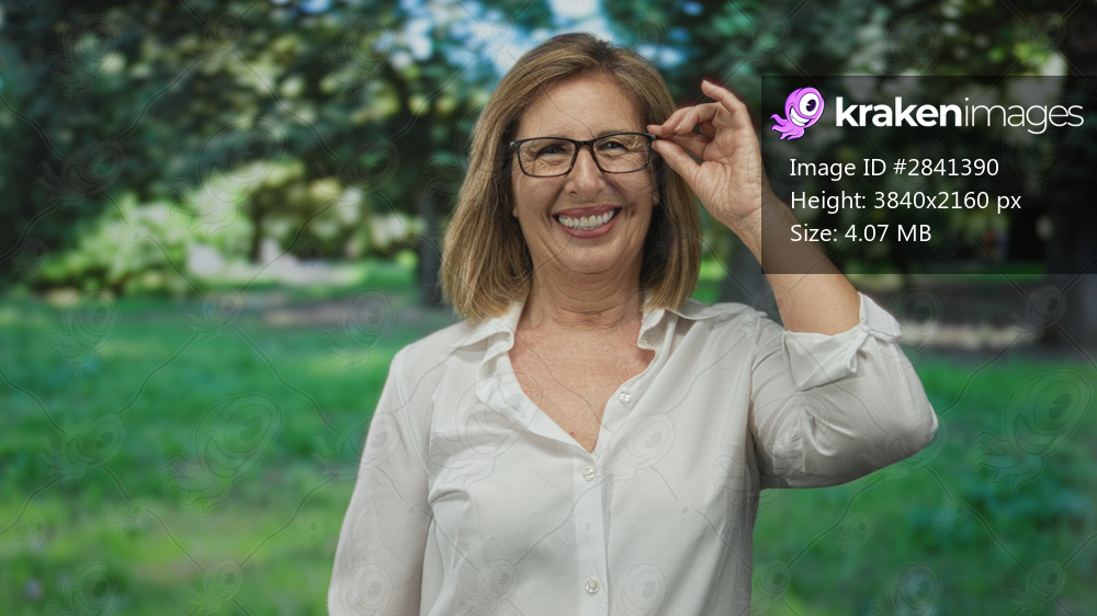 Middle aged woman in white shirt wearing glasses smiling and making ok sign in forest; approval happiness.