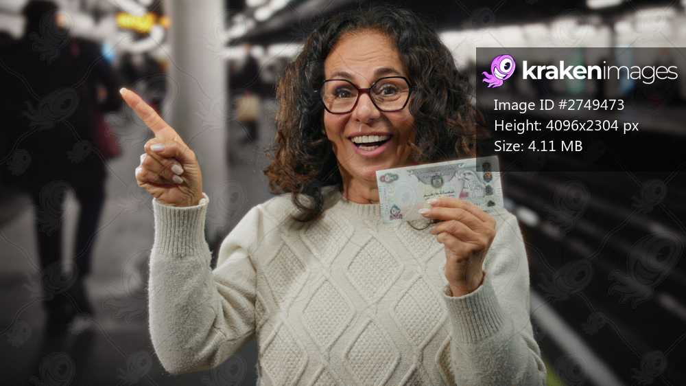 Middle-aged woman indoors at a train station in the uae holds and points to a dirham banknote with a surprised expression, surrounded by blurred commuters. - Kraken Images