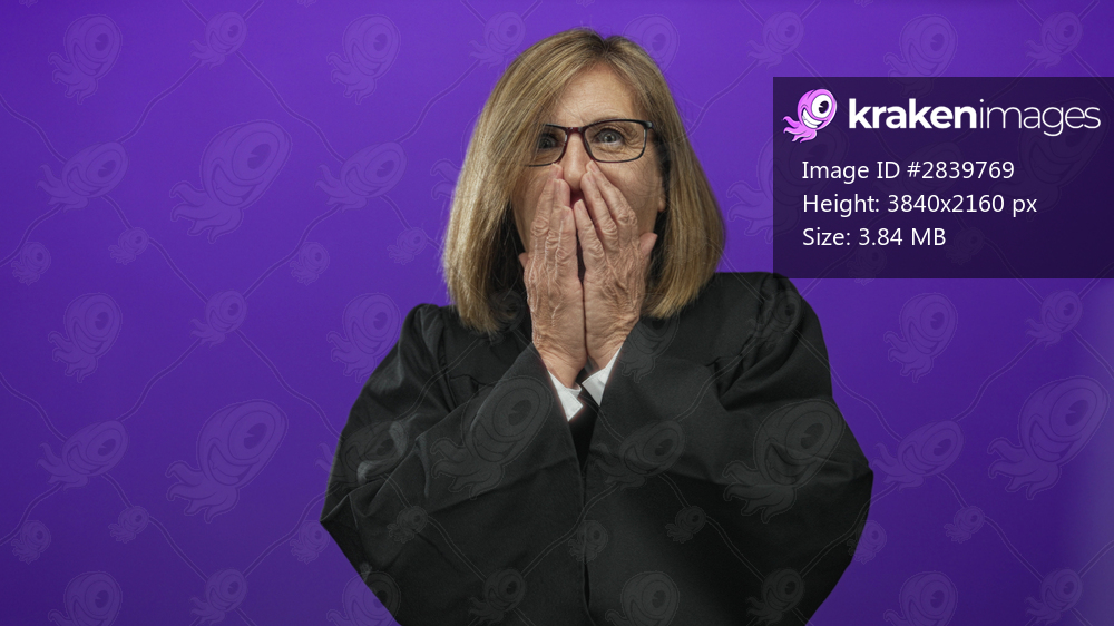 Middle aged woman judge with glasses covers mouth with both hands front facing in purple studio; surprise hush.