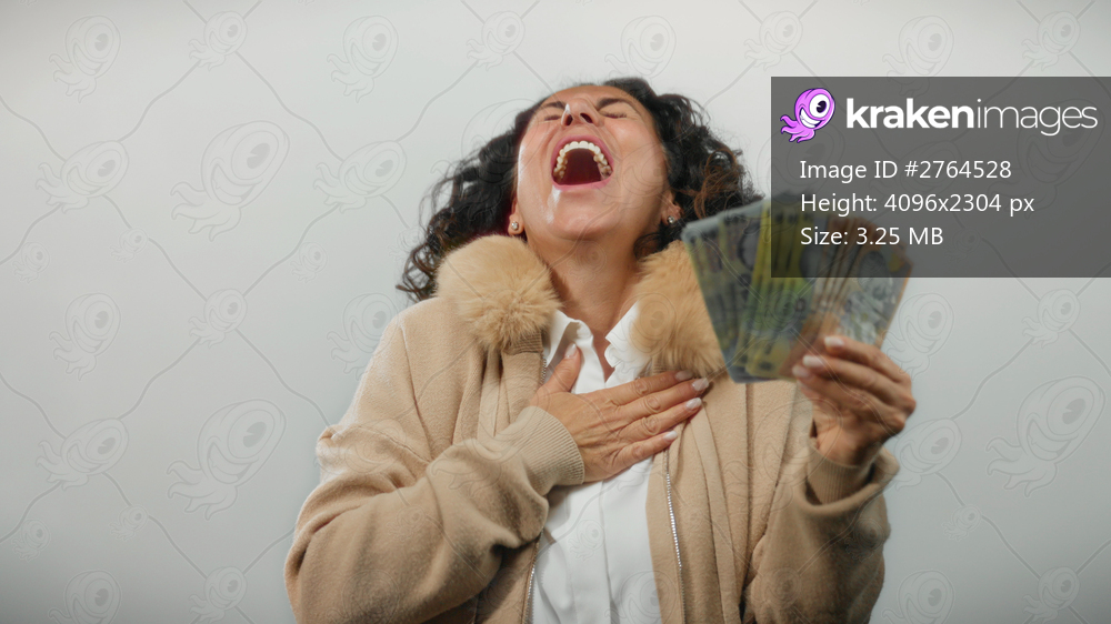 Middle-aged woman laughing holding romanian banknotes against a white background, embodying financial success and joy.