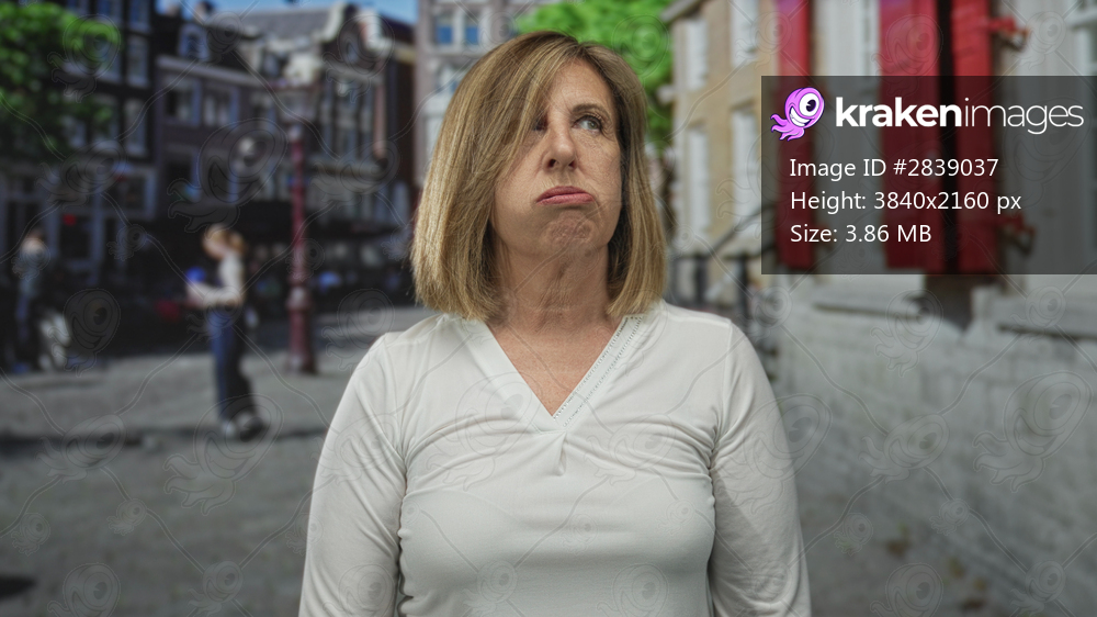 Middle aged woman looking upward on sunlit street beside red shutters showing her face; quiet reflection.