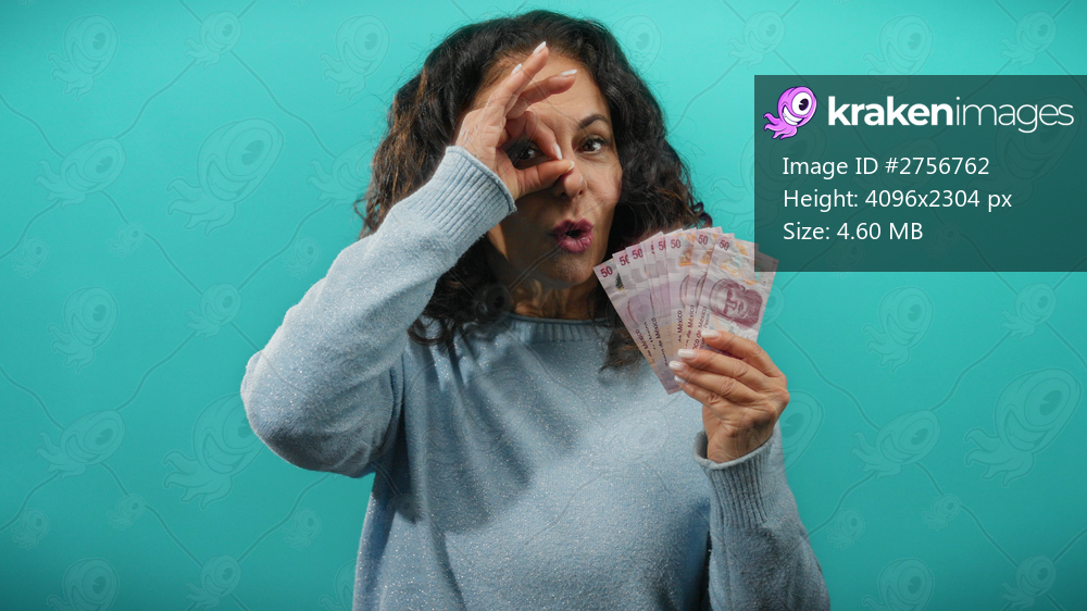Middle-aged woman makes an ok gesture over her eye while holding mexican pesos against a blue wall, conveying a playful financial theme.