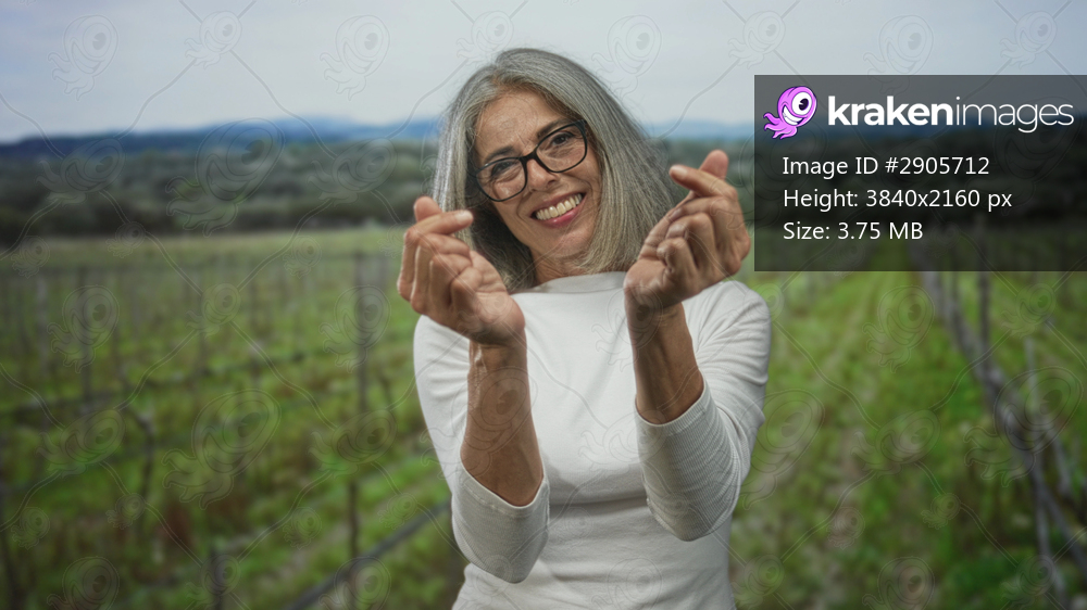 Middle aged woman makes finger heart gesture with hands in a green field during daytime; joy connection.