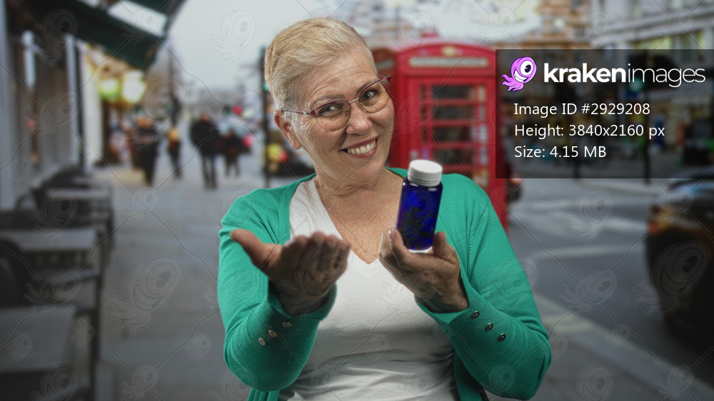 Middle aged woman offering a blue pill bottle with outstretched hand on a city street; hopeful health reassurance.