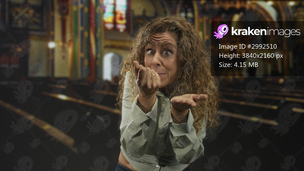 Middle aged woman with open hands palms up asking gesture in ornate church building, stained glass and pews visible; faith pleading.