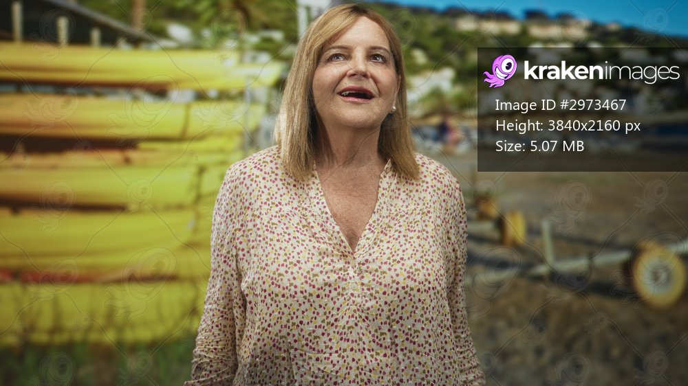 Middle aged woman with open mouth and visible chest speaking in a studio beach backdrop, patterned blouse and earrings visible; serenity memory nostalgia. - Kraken Images