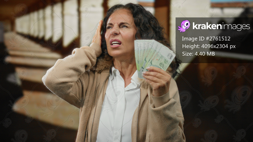 Middle-aged woman outdoors at university holding singapore banknotes with a pained expression suggestive of financial stress in an academic setting.