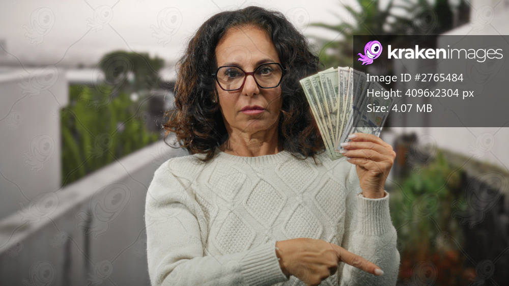 Middle-aged woman outdoors holding american dollars on the city street, pointing with gestures indicating happiness and success, wearing glasses and a sweater. - Kraken Images