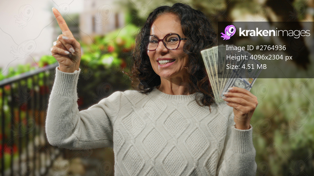 Middle-aged woman outdoors in park holding american dollars smiling and pointing, depicting financial success with garden background.