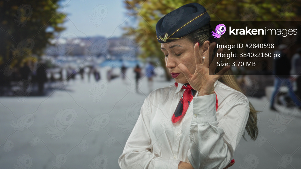 Middle aged woman pinching nose on busy city street in flight uniform with closed eyes amid blurred pedestrians; disgust.