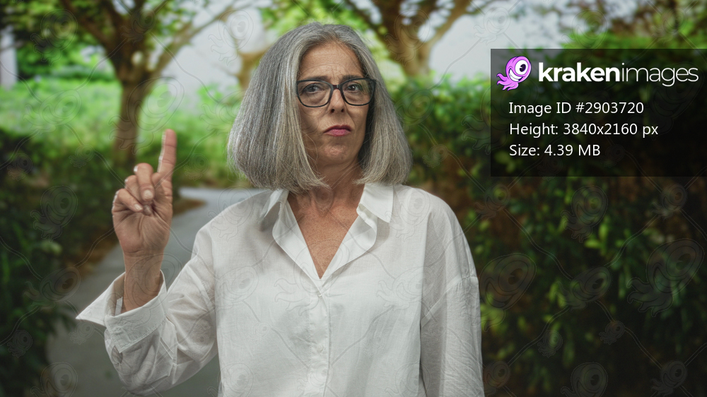 Middle aged woman points finger on forest path in park, grey hair, glasses and white shirt, facing camera with raised index finger; authority.