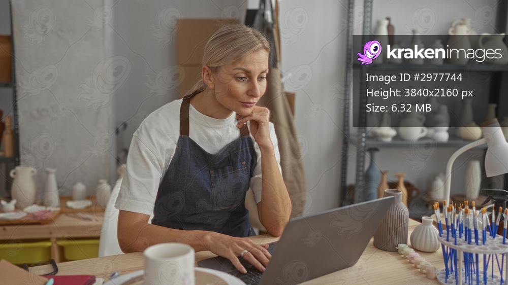 Middle aged woman potter types on laptop, hand to chin while reviewing ceramics on table in pottery studio; contemplation.
