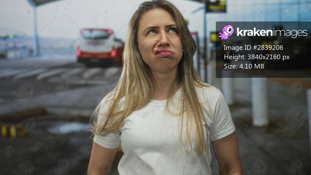 Middle aged woman pouts lips under canopy at airport terminal near shuttle bus at curbside; disgust.