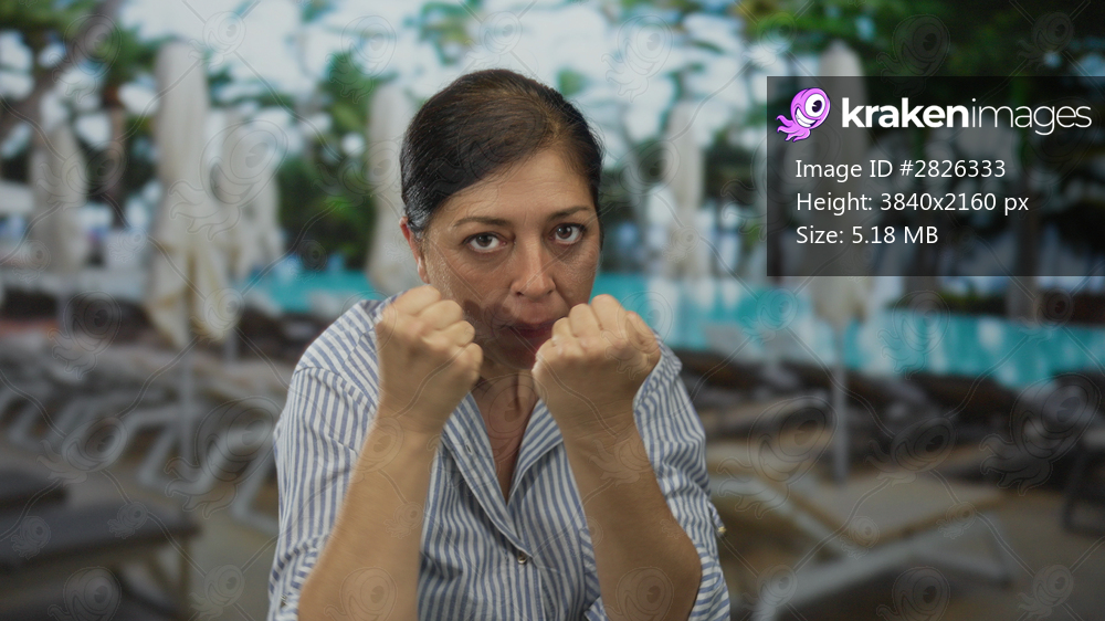 Middle aged woman punching with clenched fists in striped shirt by outdoor pool deck; determination.