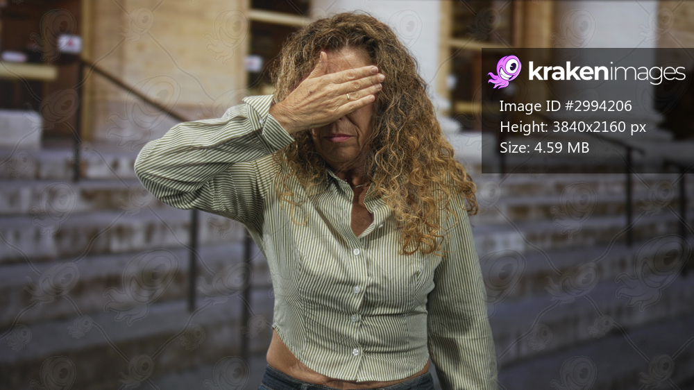 Middle aged woman shielding face with hand on stone building steps, striped shirt and curly hair visible, slight grimace suggests shielding from light; vulnerability. - Kraken Images