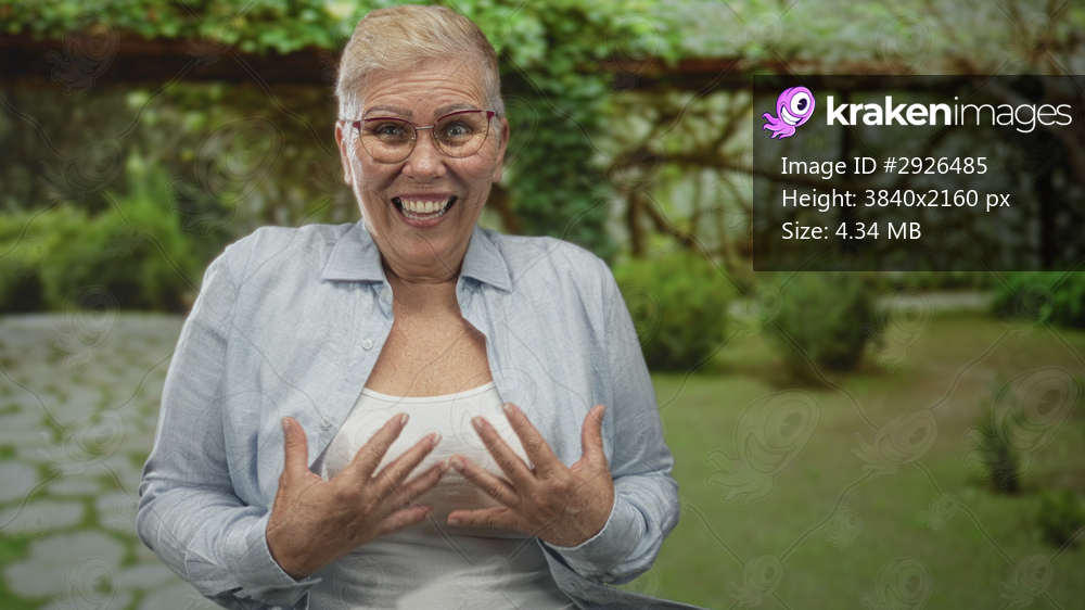 Middle aged woman with short hair and glasses pressing hands to chest and smiling on a green forest path near wooden arch; playful surprise.