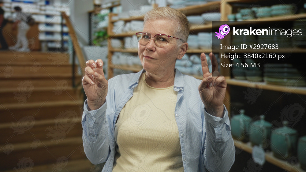 Middle aged woman showing air quotes with fingers in decor shop aisle among ceramic shelves; playful doubt.