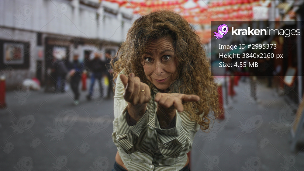 Middle aged woman showing open palms in a beckoning gesture on a crowded urban street market with hanging lanterns, blurred pedestrians and storefronts; playful invitation. - Kraken Images