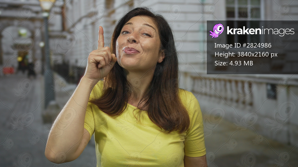 Middle aged woman smiles while pointing finger upward on street; curiosity wonder inspiration optimism.