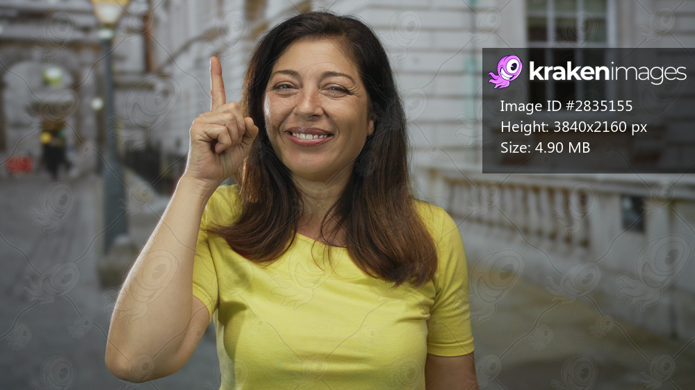 Middle aged woman smiles while pointing finger upward on street; curiosity wonder inspiration optimism.