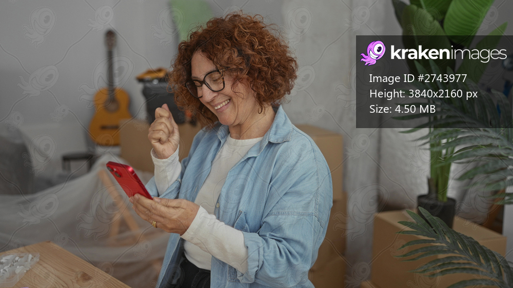 Middle-aged woman smiling at smartphone in new home living room with unpacked boxes plants and guitar creating a joyful indoor unpacking scene