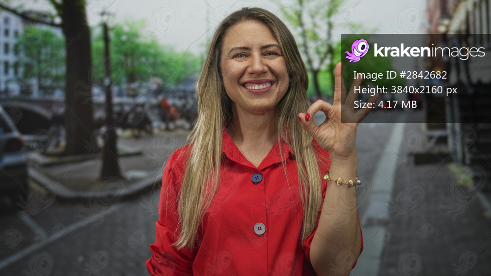 Middle aged woman smiling with hand making ok sign on a busy street lined with parked bicycles; approval.