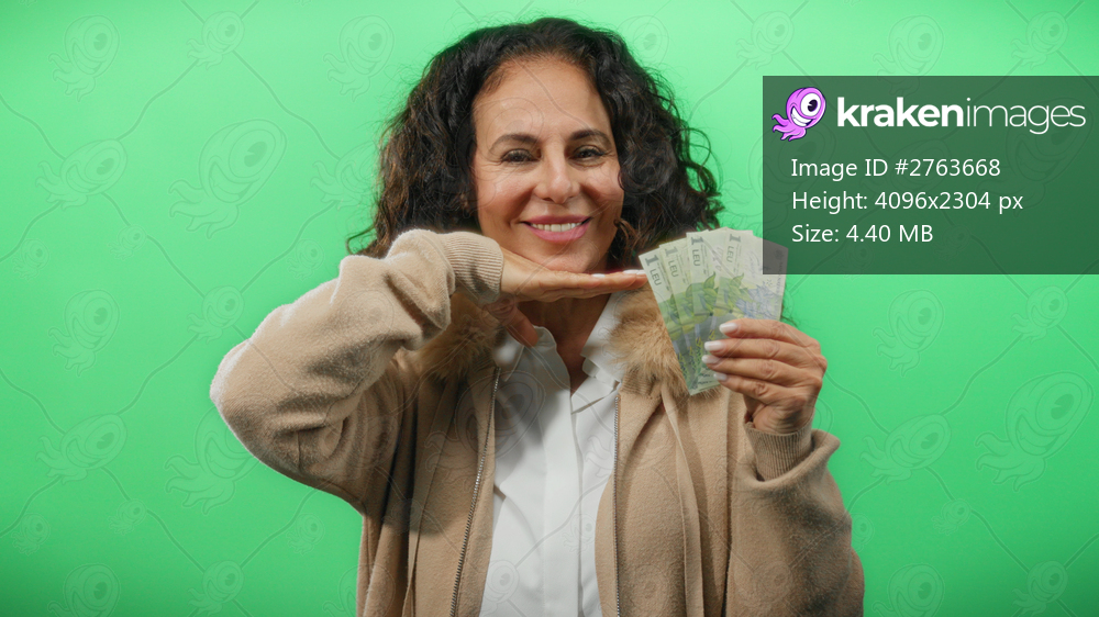 Middle-aged woman smiling and holding romanian banknotes against a green isolated background symbolizing wealth and contentment.