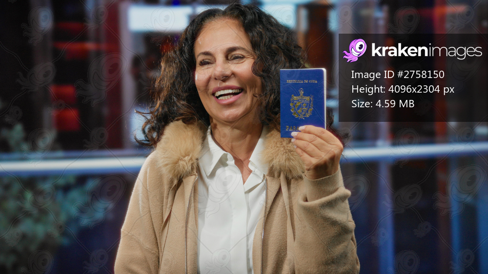 Middle-aged woman smiling indoors at hotel reception holding a cuban passport, conveying travel, identity, and cultural context.