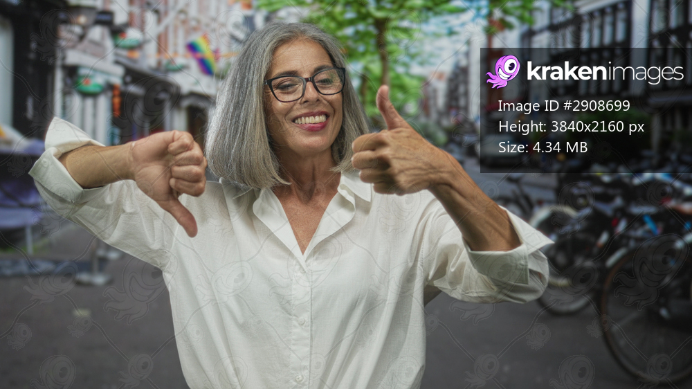 Middle aged woman smiling and showing thumbs up and thumbs down on a busy city street lined with bicycles and brick buildings; ambivalence.