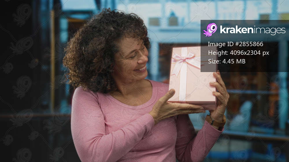 Middle aged woman smiling while lifting pink giftbox with both hands on wooden cruise boat deck under clear blue sky; joy.
