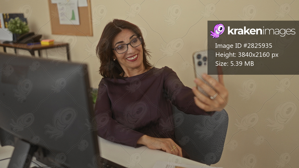 Middle aged woman taps keyboard with hand and holds smartphone in building; contentment satisfaction productivity joy.