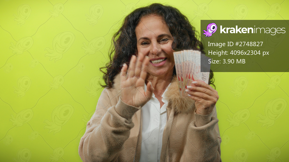 Middle-aged woman waving at the camera holding singapore dollars, standing against a vivid yellow background in an expressive and cheerful pose.