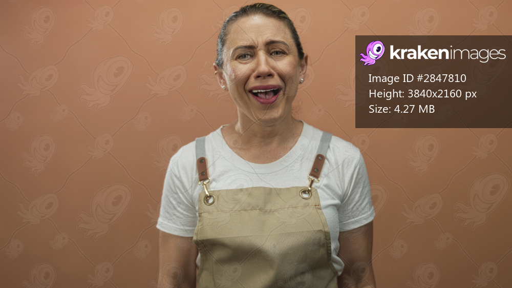 Middle aged woman wearing apron stands center frame with mouth open gesture in studio before peach wall; surprise.
