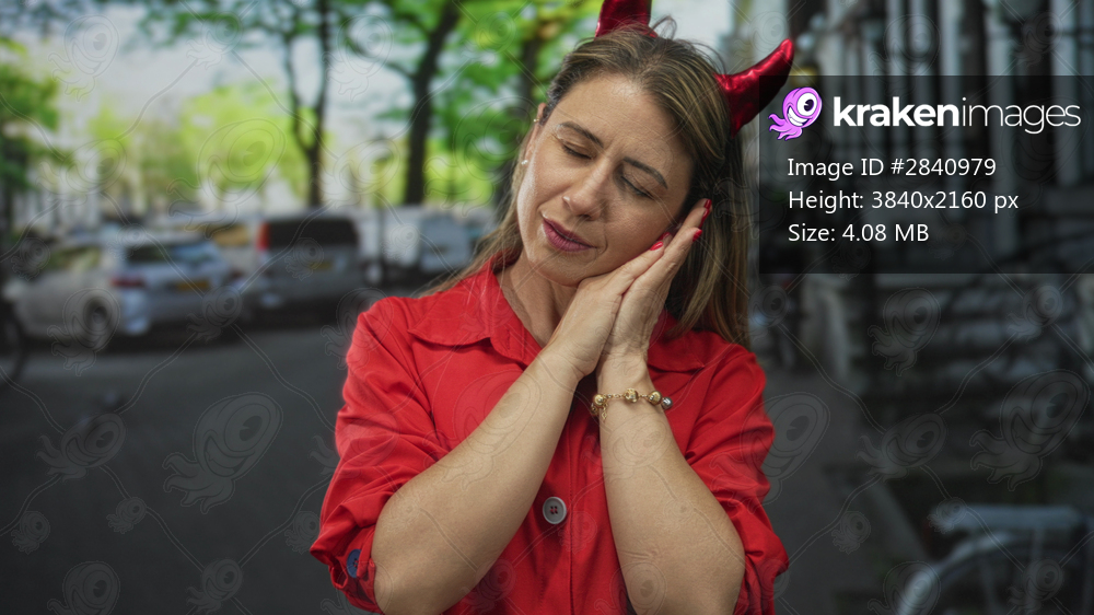Middle aged woman wearing devil horns headband touches her ear on quiet city street in bright red outfit; serenity.