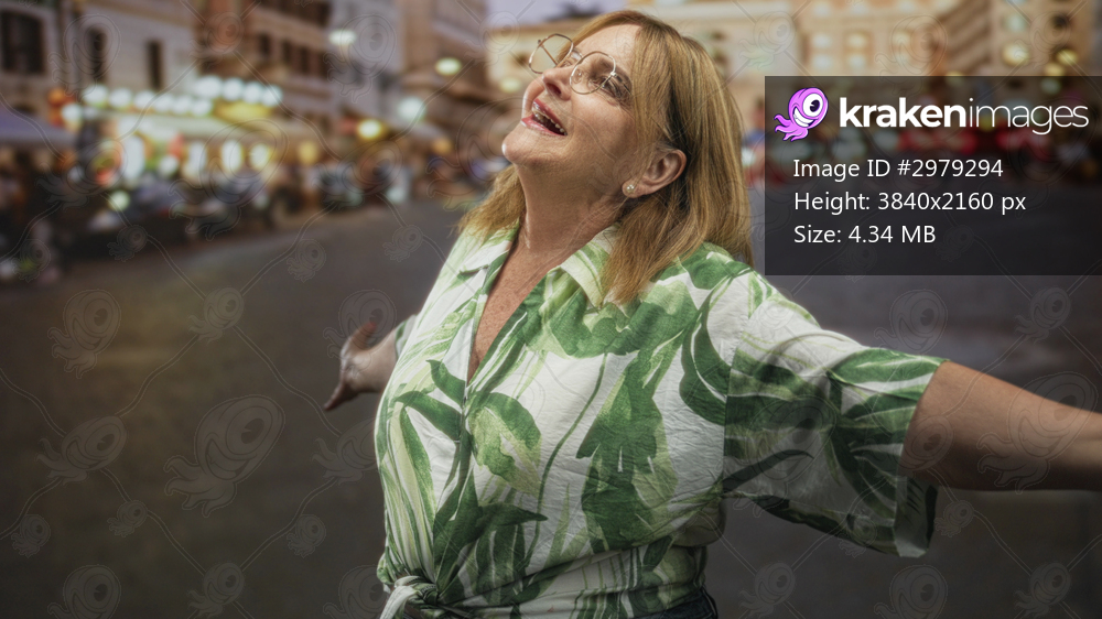 Middle aged woman wearing glasses and a green tropical shirt, arms outstretched with open hands and head tilted up smiling in a street; joyful freedom. - Kraken Images