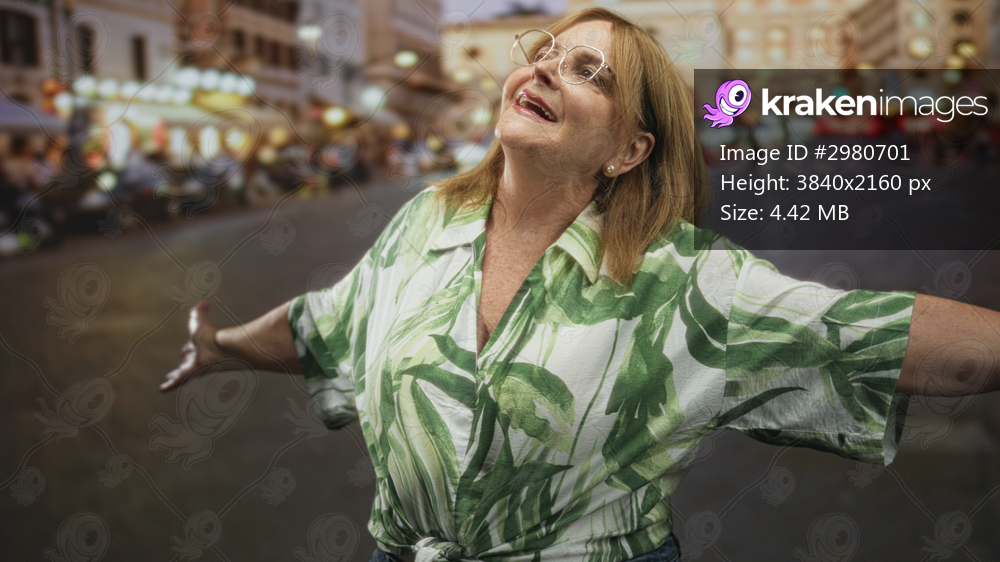 Middle aged woman wearing glasses and a green tropical shirt, arms outstretched with open hands and head tilted up smiling in a street; joyful freedom. - Kraken Images