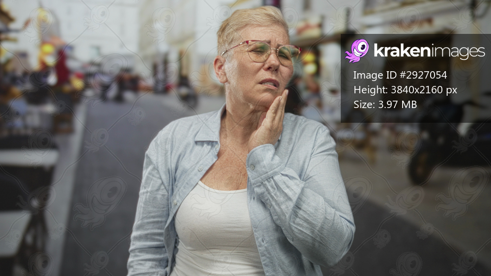 Middle aged woman wearing glasses and denim shirt holding cheek with hand on a crowded city street, wincing and showing toothache; toothache pain.