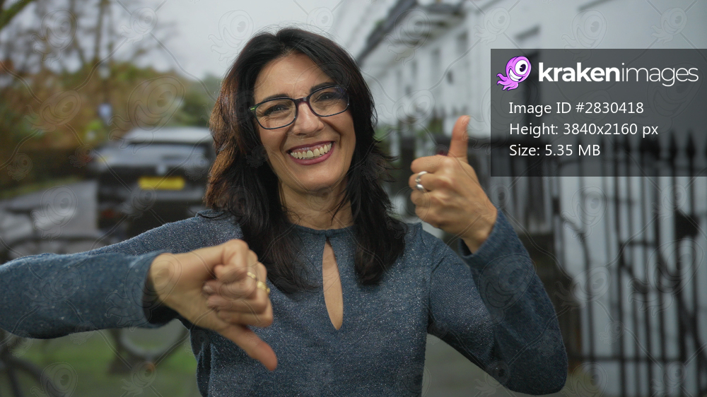 Middle aged woman wearing glasses gives thumbs up and thumbs down with both hands on city street; indecision.