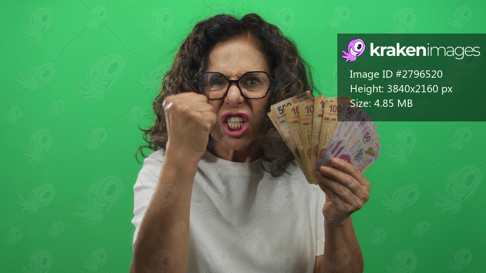 Middle aged woman wearing glasses holds mexican peso banknotes and shakes fist in studio; anger frustration financial stress.