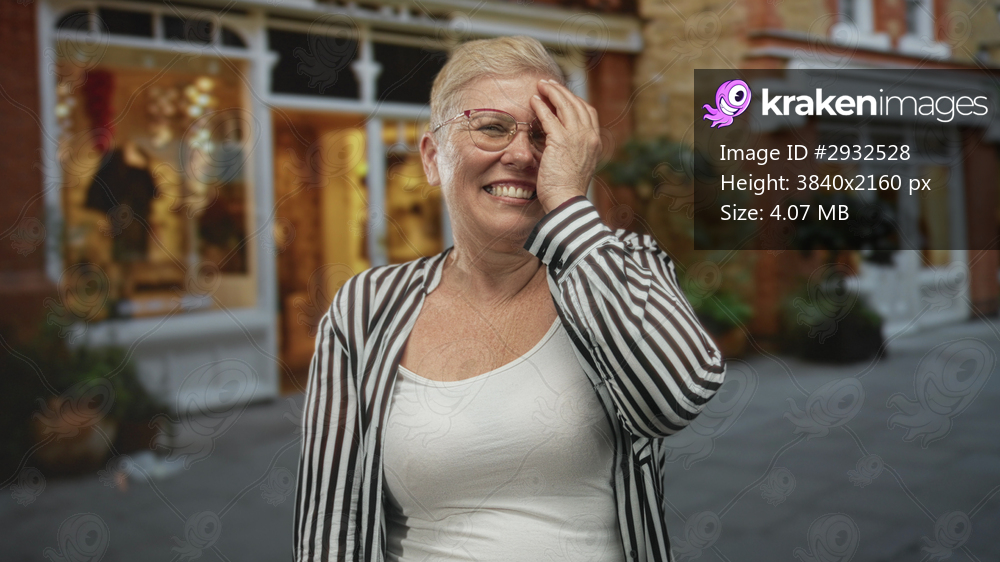Middle aged woman wearing glasses laughing with hand to forehead and striped shirt on a city shopping street; playful joy.